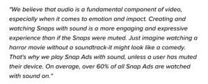 We all know how powerful the right music can be in drawing out emotion; Snap had figured out how do this in a way that enhanced rather than disturbed a user’s experience. As a result, Facebook announced the reversal of their audio-off default policy in 2017. Sound on would be its default unless a user muted their device.